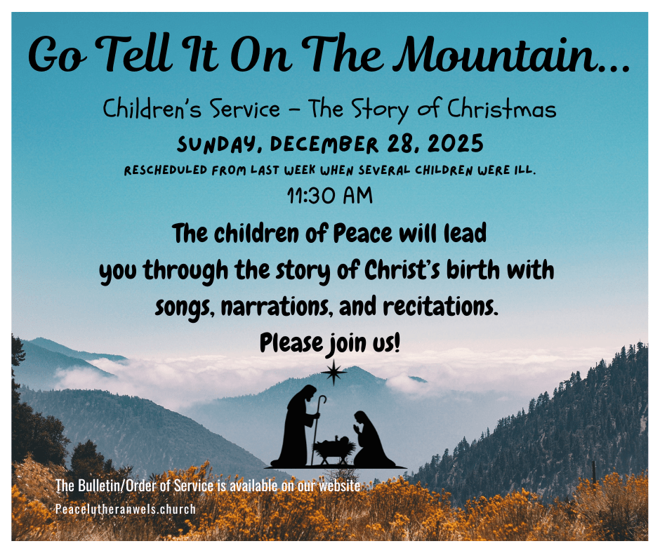 This service was cancelled last week because of children’s illnesses. Please join us this week as we experience our children telling the story of Jesus’ birth!